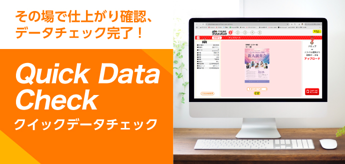 入稿時にその場でデータに不具合がないかを確認いただける便利なサービスです。ご注文前にチェックできる「ご注文前クイックデータチェック」も大好評。ともに無料でご利用いただけます。