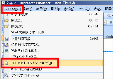 (1) 左上の「ファイル」をクリックし、 「PDF またはXPS 形式で発行」を クリックする。 |