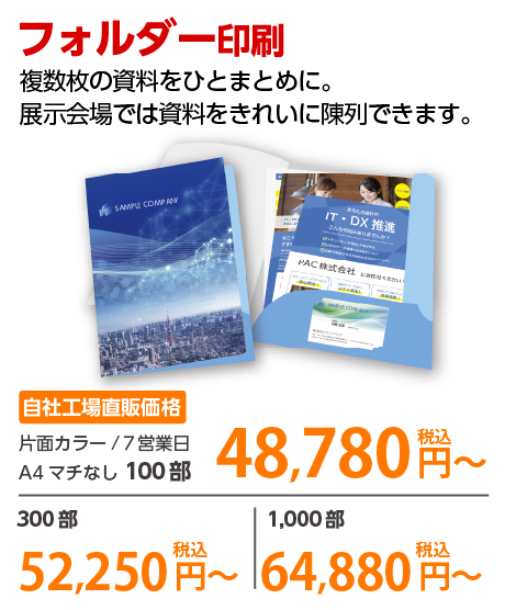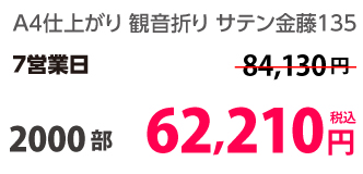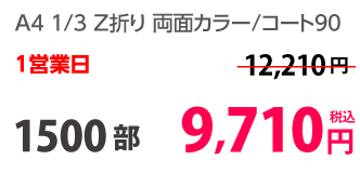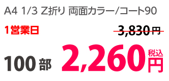 | A4 仕上がり | 二つ折り | 両面カラー | コート90 | 100部 | 3,980 円 | 1000部 | 9,450 円 |