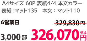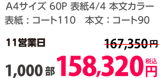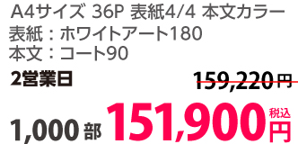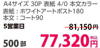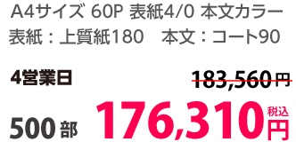 | A4 | 表紙・本文カラー | コート90/コート110 | 24P | 500部 | 58,750 円 | 1,000部 | 73,950 円 |