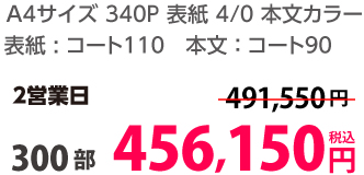 | A4 | 表紙・本文カラー | コート90/コート110 | 24P | 10部 | 3,090 円 | 100部 | 12,690 円 |