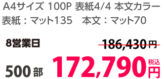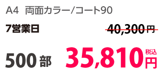 | A4 | 両面カラー | コート90/コート90 | 8P | 500部 | 13,610 円 | 5,000部 | 45,510 円 |