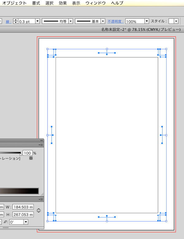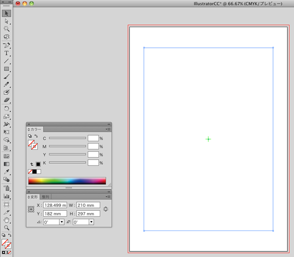 アートボードを大きくしたら、仕上がりサイズの矩形(長方形)ボックスを長方形ツールで作成します。アートボードの中央に長方形のボックスを配置します。長方形オブジェクトは[塗り]も[線]も「なし」に設定します。