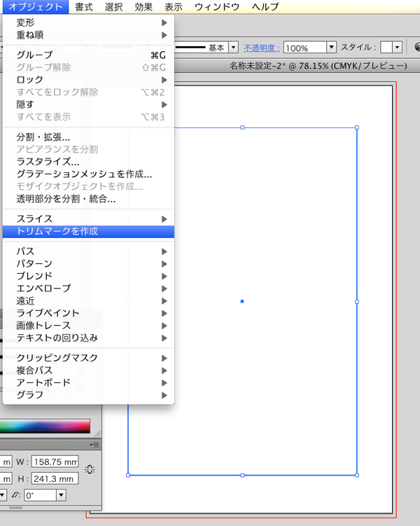 長方形オブジェクトを選択し、オブジェクトメニューから[トリムマークを作成]を選択します。オブジェクトサイズのトリムマークが作成されます。長方形オブジェクトを仕上がりサイズとしてレイアウトして下さい。