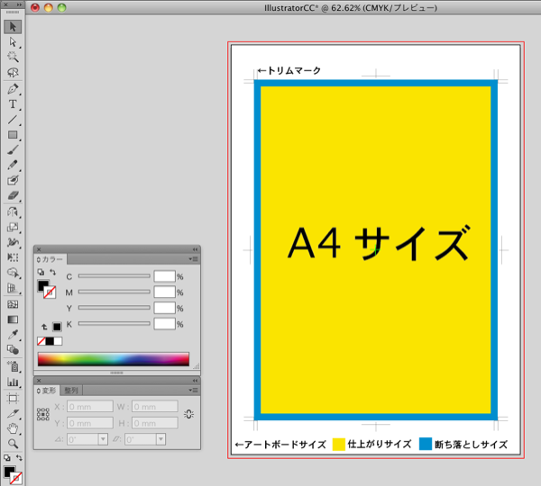 Illustrator CCから印刷用としてAIファイルを保存するときは、用紙サイズを大きくして、仕上がりサイズに対してトリムマークを作成してください。