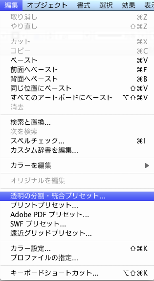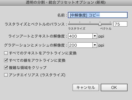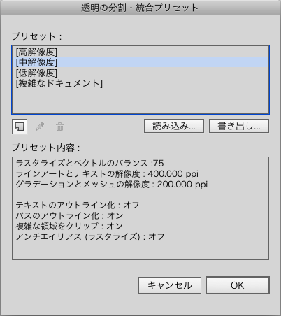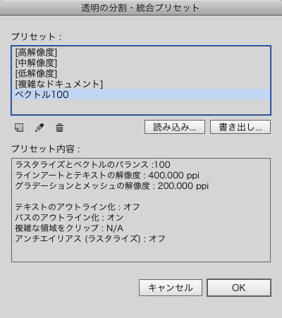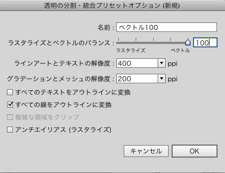 編集メニューを開いて[透明の分割・統合プリセット]を指定します。「中解像度」を選択して[新規]のボタンをクリックします。設定名に「ベクトル100」と入力して[ラスタライズとベクトルのバランス]を「100」にします。