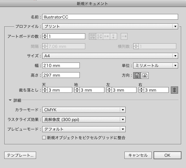 Illustrator CCでは、ファイルメニューから新規ドキュメントを作成するときは、[新規ドキュメントプロファイル]で「プリント」を選択します。「プリント」を指定すると、[カラーモード]で「CMYKカラー」が選択されます。また、[ラスタライズ効果]で「高解像度(300 ppi)」が選択されます。[カラーモード]と[ラスタライズ効果]は[詳細]を開くことで確認できます。なお、IllustratorCCでは複数のアートボードに対応しています。しかし、トラブルの原因になりますので、新規ドキュメントプロファイルの[アートボードの数]は「1」のまま作成して下さい。