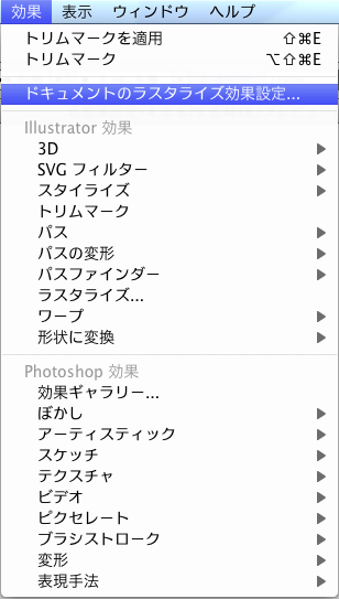 Illustratorの効果メニューで指定するドロップシャドウやぼかしは、印刷時には画像に変換されます。変換されるときの画像の品質を決めるのが、効果メニューにある[ドキュメントのラスタライズ効果設定]です。この解像度が「300 ppi」であることをご確認下さい。