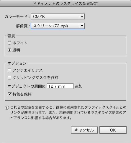 [ドキュメントのラスタライズ効果設定]ウィンドウの注意書きとして、解像度を変更すると「アピアランス(見た目)に影響する」とありますが、見た目が変わるのは「ぼかし(ガウス)」や[アンシャープマスク]などのピクセル単位で指定するものです。それ以外の[スタイライズ]内のぼかし、ドロップシャドウや光彩などの効果を絶対値で指定するものには影響しません。
