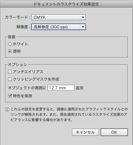なお、弊社データチェックにおいては、ラスタライズ効果の解像度設定につきましては、現在のところ確認せず進行いたしております。ご確認下さい。 |