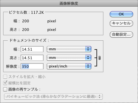 Photoshopのイメージメニューの[画像解像度]で画像の解像度を確認します。印刷用の画像データでは、1インチに「350 pixel/inch」の解像度を標準にします。写真などの画像を印刷用として使うには、「300 ppi」程度は最低でも必要です。 |