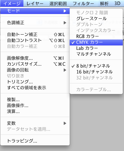 カラーで印刷する場合、イメージメニューの[モード]でカラーの画像は[CMYKカラー]にして貼り込みます。[ダブルトーン][インデックスカラー][RGBカラー][Labカラー][マルチチャンネル]は[CMYKカラー]に変換してください。グレースケール(スミ1色)の画像は[グレースケール]にして、Illustratorに貼り込んで下さい。チャンネルは[8bit/チャンネル]のみを選択してください。[16bit/チャンネル]や[32bit/チャンネル]は指定しないでください。