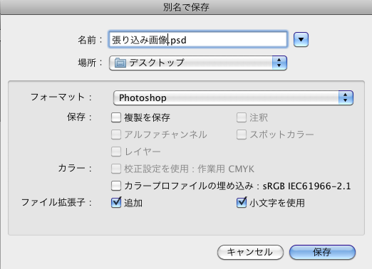 画像ファイル保存時には、Photoshop PSD形式で保存します。ICCプロファイルは含めずに保存してください(詳しくは以下をご参照下さい)。 |
