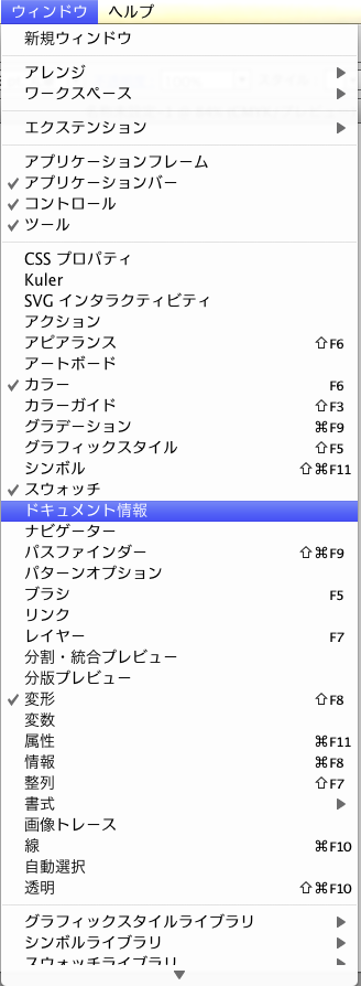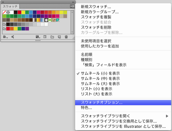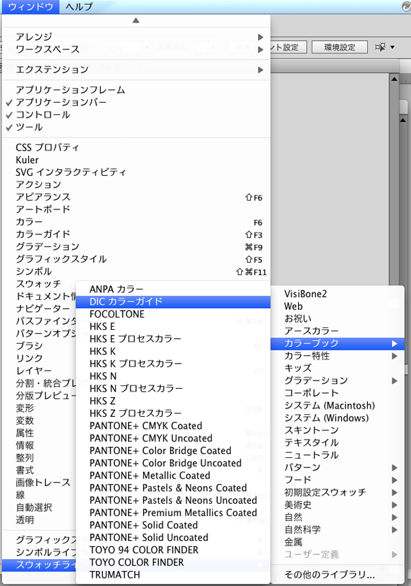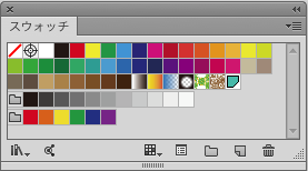ウィンドウメニューにある[スウォッチライブラリ]にあるDICやPANTONEなどの特色は使わないでください。現在弊社では、特色での印刷は対応いたしておりません。特色で指定されたオブジェクトは、弊社でCMYKに変換して出力・印刷させていただきますが、明らかな不具合が発見された場合、再度ご入稿いただく必要がございます。