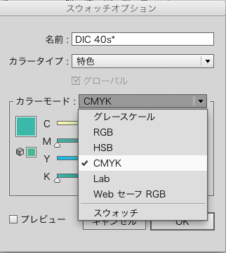 ドキュメント内に特色があるとき、スウォッチの右下に点が表示されます。特色をプロセスカラーに変換するには、特色のスウォッチを選択して、オプションメニューから[スウォッチオプション]を開きます。まず、[カラーモード]が「CMYK」であることを確認します。次に[カラータイプ]を「特色」から「プロセスカラー」に変更してください。「プロセスカラー」に変換されると、右下の点が表示されなくなります。 |