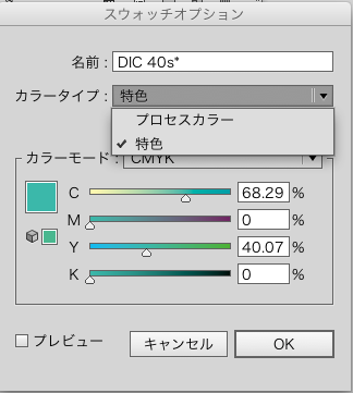 Illustrator CCでは、線や塗りに特色を指定しCMYKと混在することが可能です。特色の線や塗りのオブジェクトはCMYKに変換すると、予想外のカラーになることがあります。特色では指定しないでください。