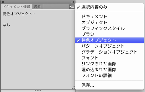 [ドキュメント情報]のオプションメニューでは「選択内容のみ」をチェックせずに「特色オブジェクト」を選択します。「選択内容のみ」がチェックされていると、選択されたオブジェクトのドキュメント情報しかリストされません。また、Photoshop EPS画像を貼り込んだ場合、画像のカラーモードは[書類情報]ではリストされません。画像のカラーモードはPhotoshopでご確認ください(「2-2 カラーを[CMYKカラー]と[グレースケール]にする」参照)。 |