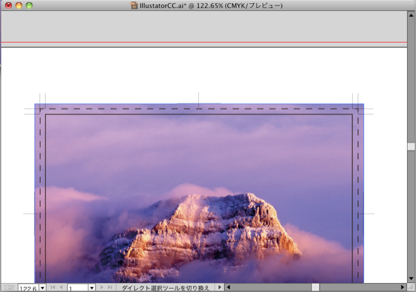 画像に塗り足しを作成する場合は、裁ち落とし(塗り足し)サイズの長方形オブジェクトを作成し、裁ち落としの位置に配置します。オブジェクトを画像の前面に配置して、オブジェクトメニューから[クリッピングマスク─作成]します。画像のクリッピングマスクは裁ち落とし位置でなくても、トリムマークからはみ出していなければOKです。 |