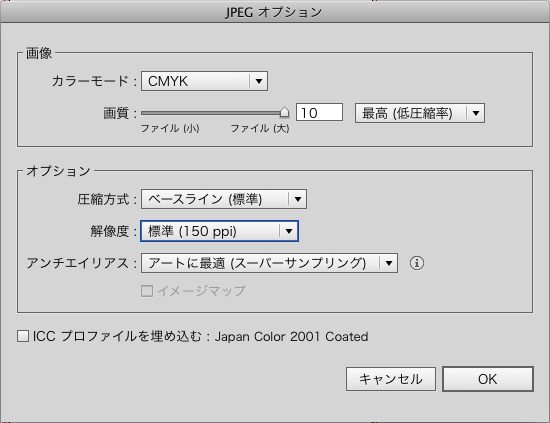 [カラーモード]は「CMYK」に、[深度]は「中」にします。また、[オプション]の「アンチエイリアス」は「アートに選択」を選択して、「ICCプロファイル埋め込む」はオフにしてください。保存したJPEGデータは、Photoshopで開いてレイアウトをご確認ください。確認後、AIデータとともに入稿してください。 |
