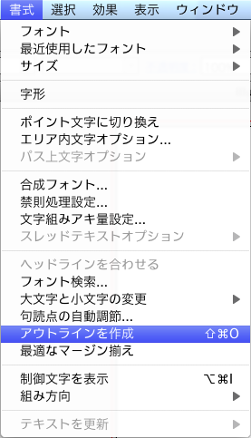 ページ内のテキストはすべてアウトライン化します。編集メニューから[すべてを選択]し、すべてのオブジェクトを選択します。書式メニューの[アウトライン作成]すると、選択されたテキストはアウトライン化されます。