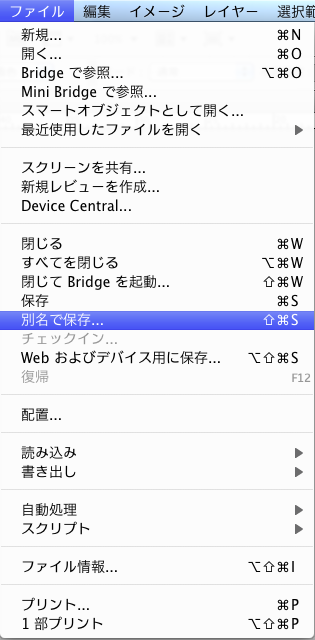 Photoshopのファイルメニューから[別名で保存]を選択します。[フォーマット]で「Photoshop PSD」を選択します。[カラー]では[プルーフ設定を使用]も[カラープロファイルの埋め込み]もオフにします。