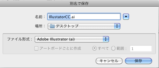ファイルメニューから[別名で保存]を選択します。保存時のウィンドウの[フォーマット]で「Adobe Illustrator 書類」を選択します。Macintosh版ではファイル名に拡張子として「.ai」が、追加されていることを必ず確認して下さい。