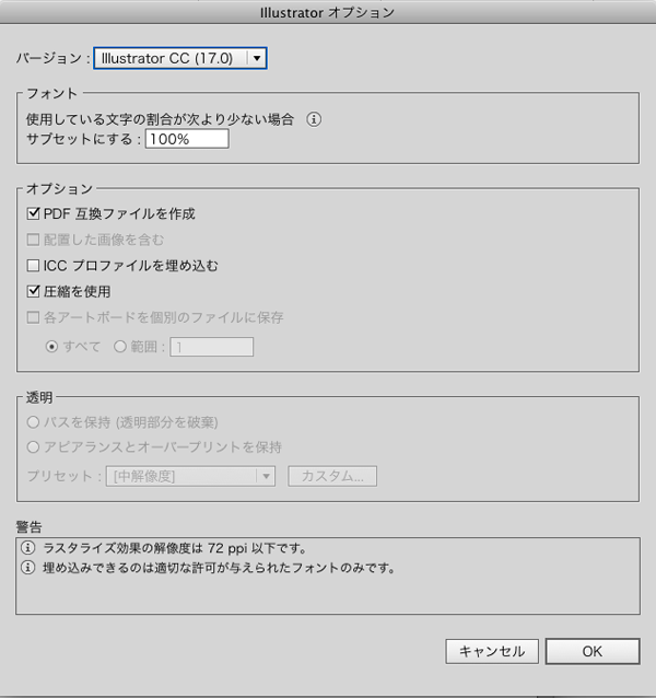 またIllustrator CCからIllustrator形式(AI)で入稿する注意点として