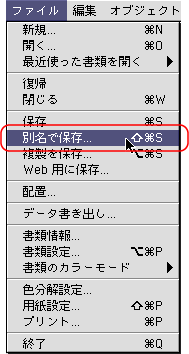 ファイルメニューから[別名で保存]を選択します。保存時のウィンドウの[ファイル形式]で「Adobe Illustrator 9.0書類」を選択します。Macintosh版ではファイル名に拡張子として「.ai」を、必ず追加してください。