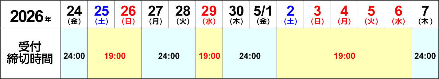 | 2営業日以内発送~ | 24時 | 19時 |
