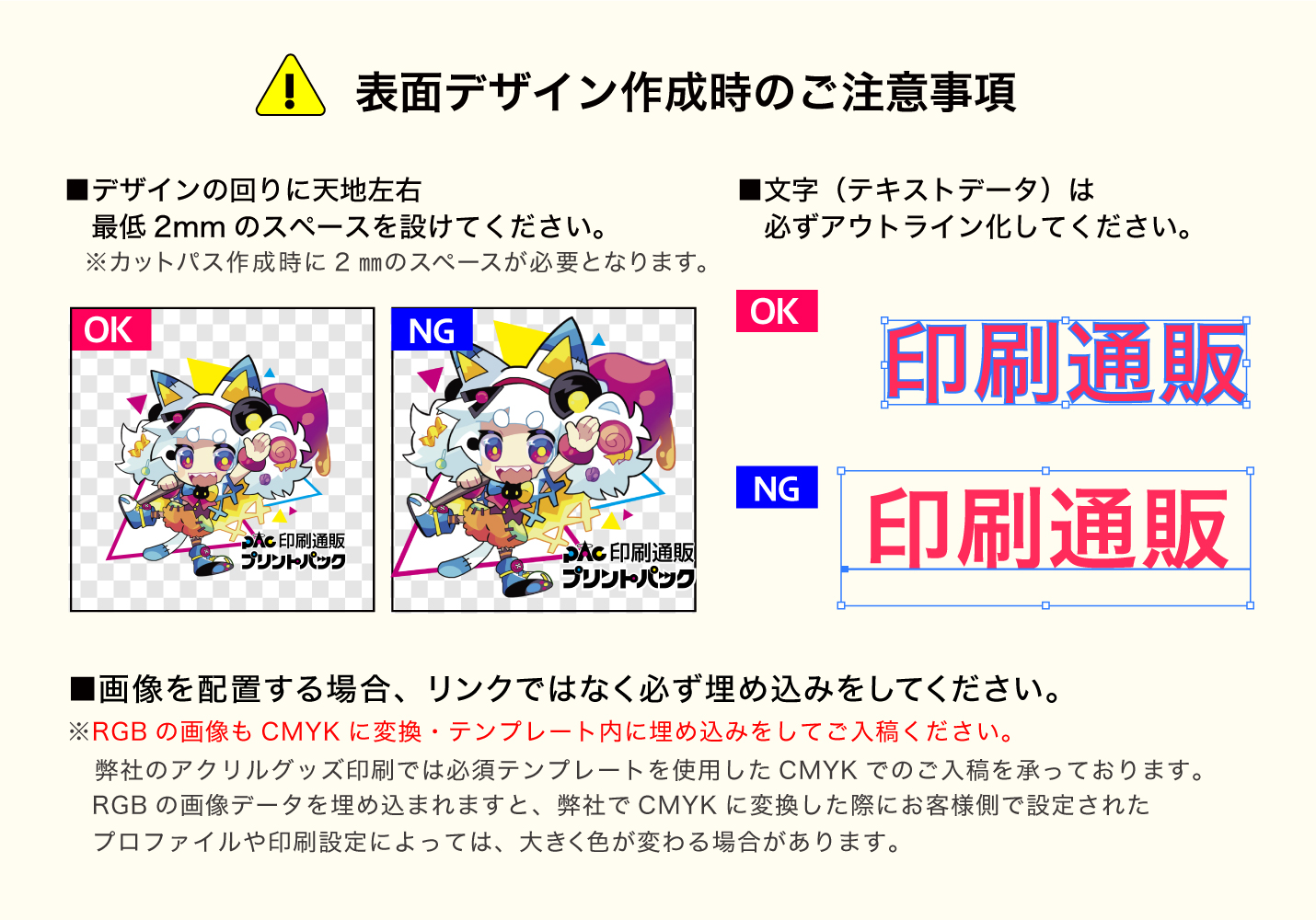 ※2mm以上のスペースがないとカット不備や、印刷剥がれの原因となります。