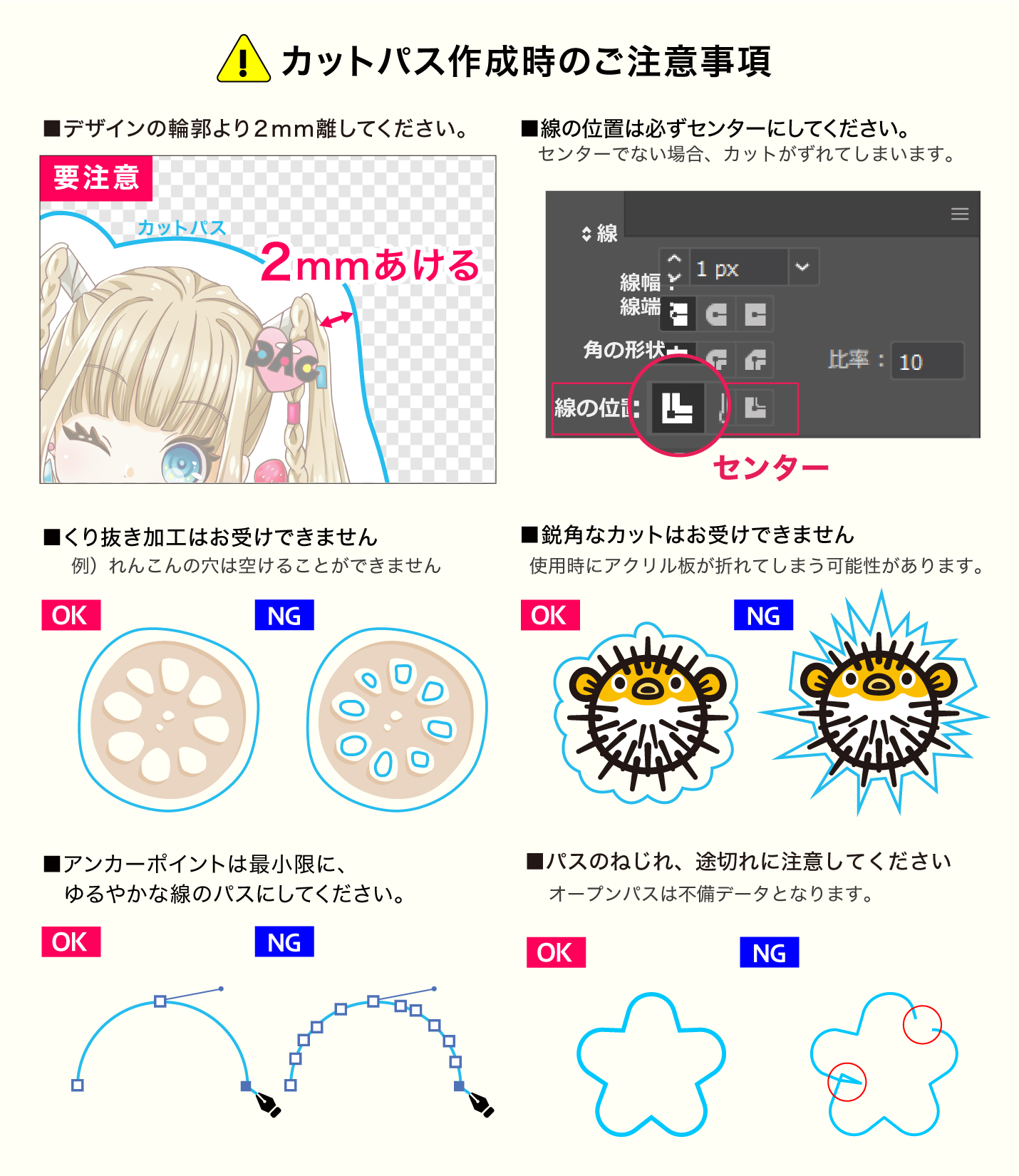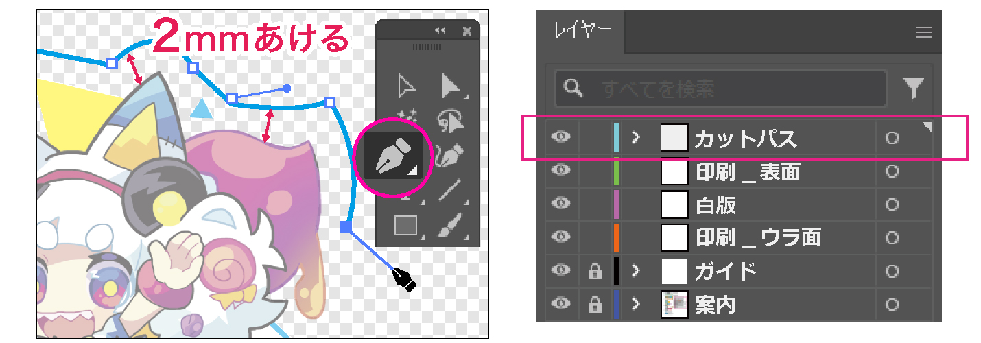 デザインとカットパスの間は必ず2mm以上あけてください。