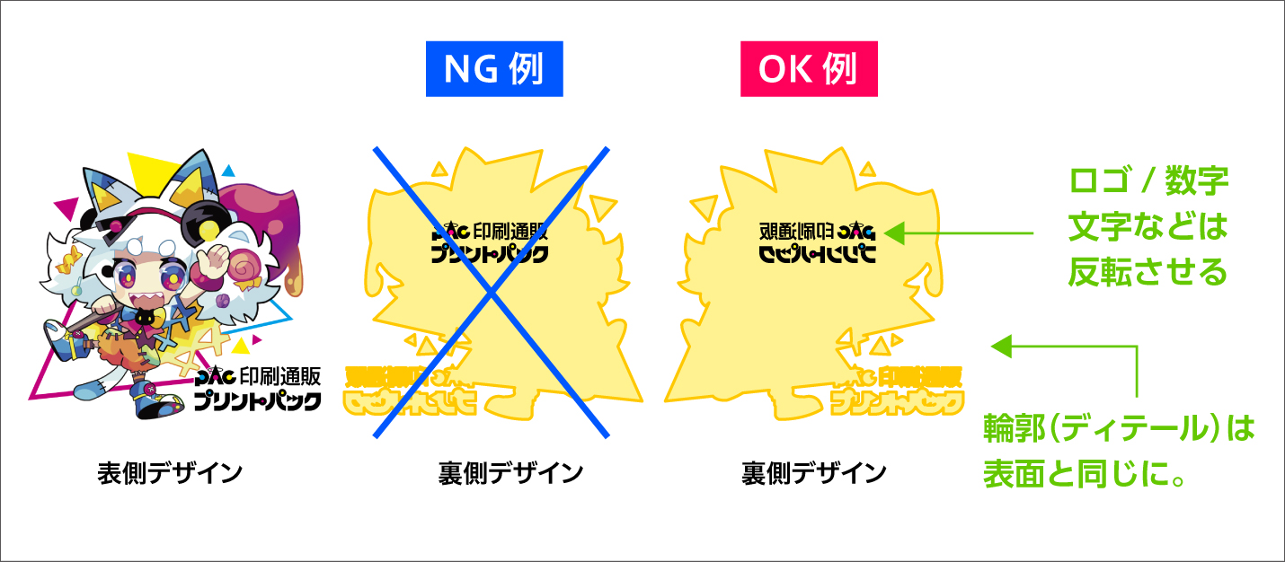 - 裏面デザインの文字やロゴは反転する前提で作成できている