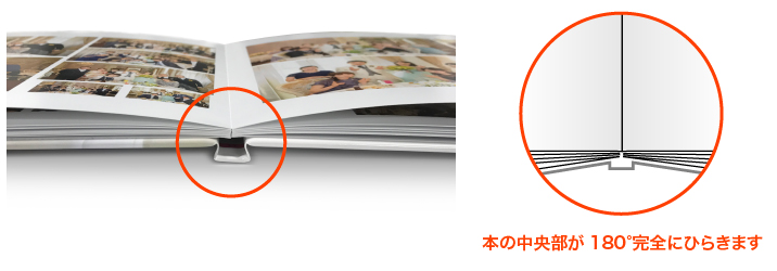 開いたときの中心部が180°完全に開く製本で、見開き2ページにわたって写真を切れ目なく
