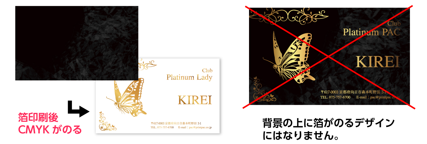 箔が上に来ることを想定したデザインの場合、意図した仕上がりになりませんのでご注意ください。