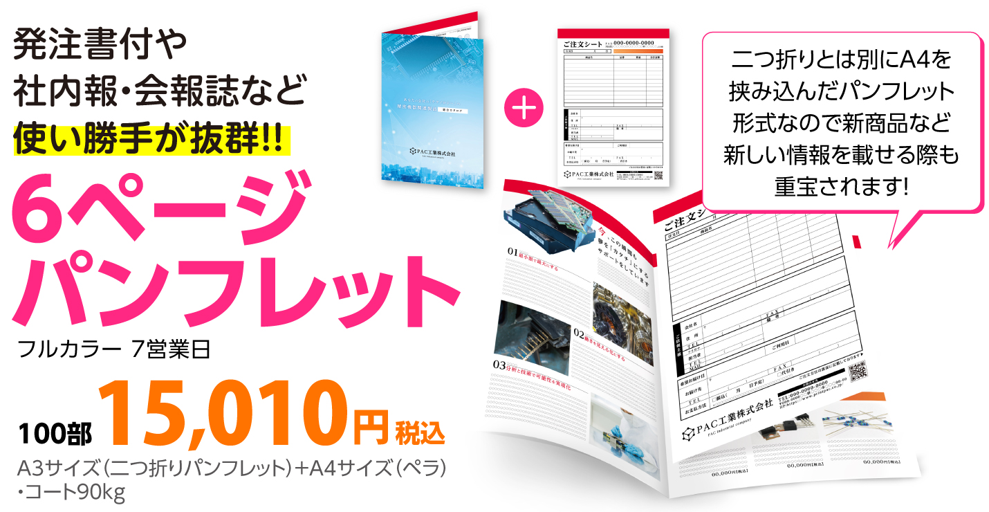 「6ページパンフレット」はA3二つ折りの商品パンフレットにA4サイズの