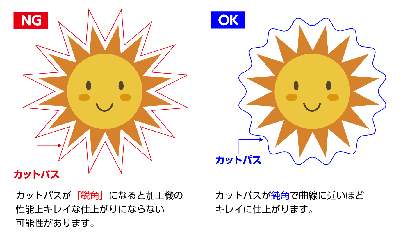 カットパスギリギリのデザインの場合、誤差により周囲に白いフチが出る可能性があります。