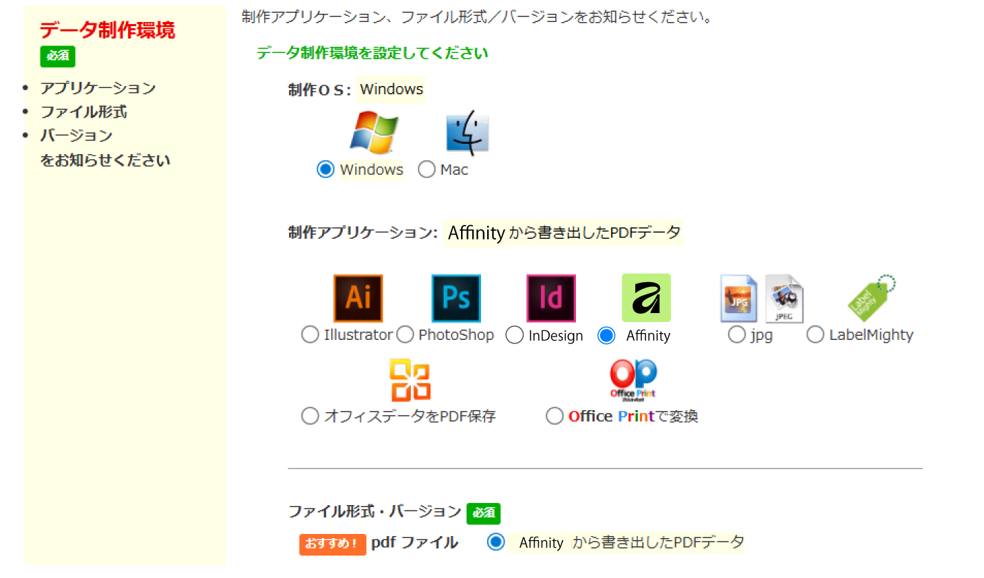 ご注文 カート内のデータ制作環境、制作アプリケーションで「Affinity」をお選びいただき、