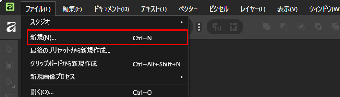 【1】ファイルメニューの【ファイル】⇒【新規】を選択
