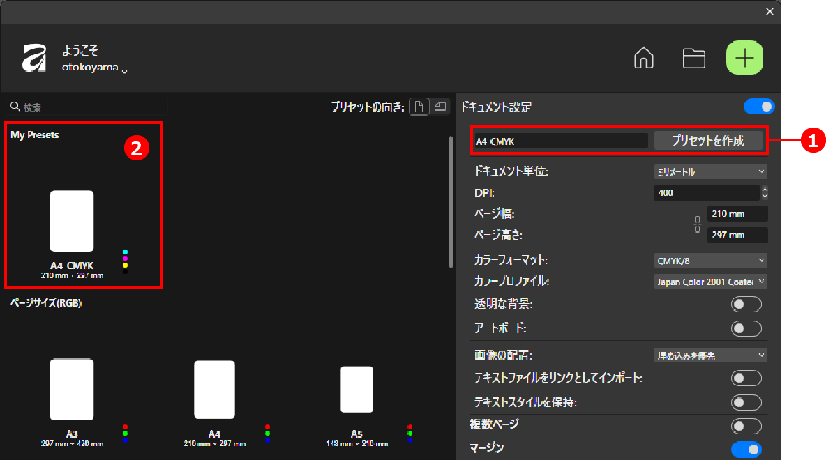 ドキュメント設定のプリセットを作成しておくとで次回以降の作成がスムーズになります。