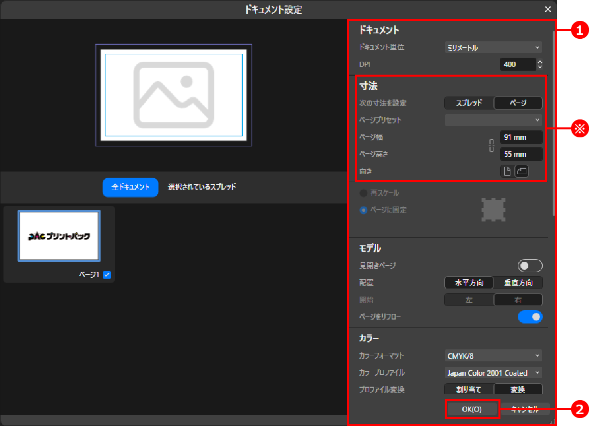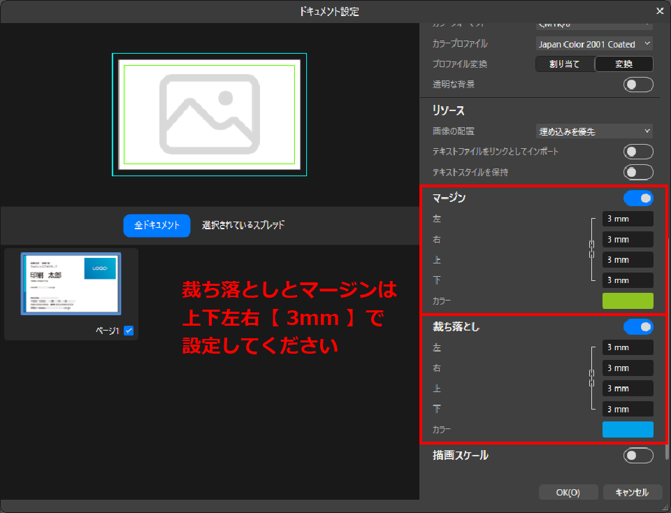 【3】画面右側の【ドキュメント設定】を下記に設定(RGBとCMYKで設定が異なります)