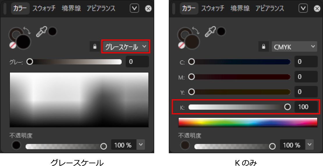スミ1色印刷をご希望の場合は【グレースケール】または、CMYK の【K】のみでデータを作成してください。