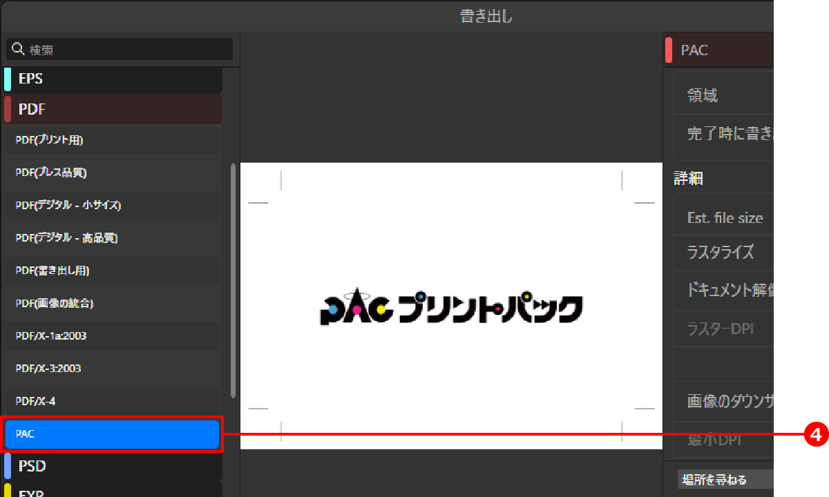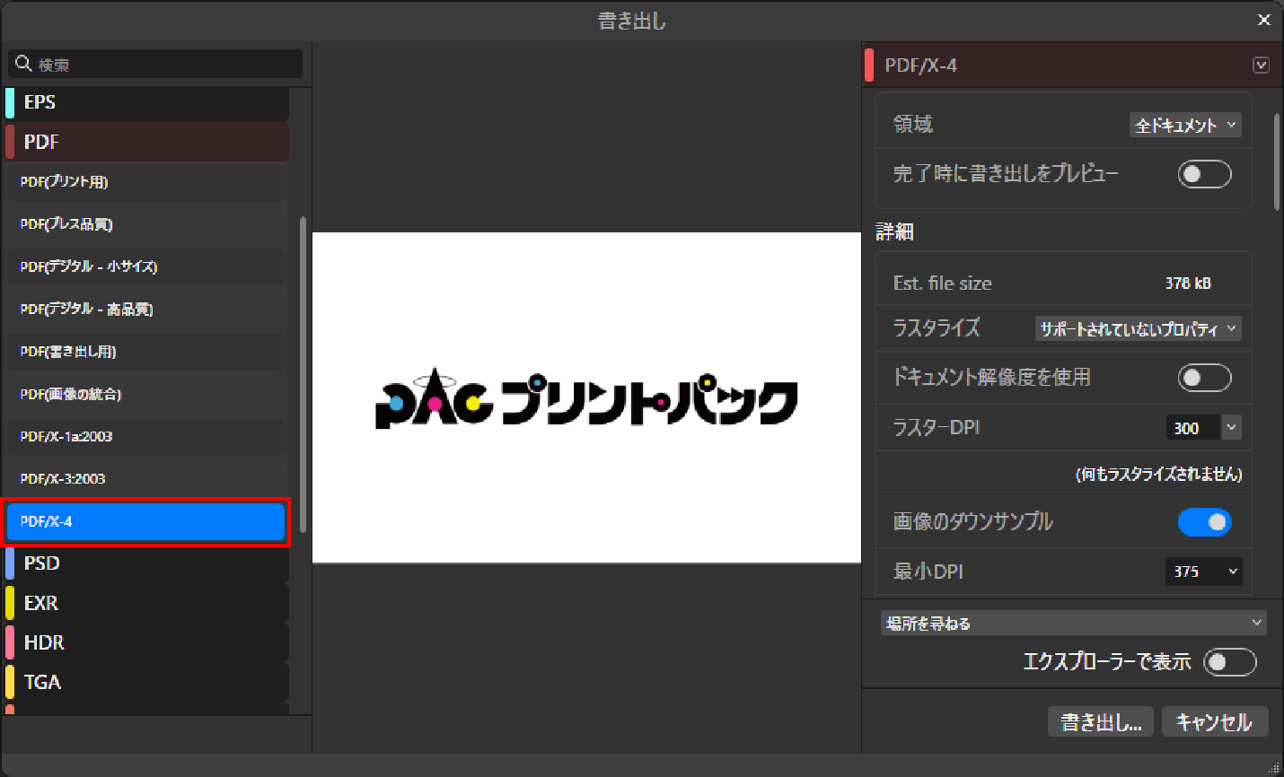 【2】画面左側のファイル形式一覧から【PDF】 ⇒ 【PDF/X-4】を選択