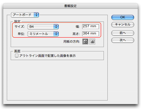また、名刺やハガキなどの「B6」以下のサイズは、「B5」サイズにアートボードサイズを変更して作成してください。正しく作成されていない場合は、再入稿していただくことがあります。
