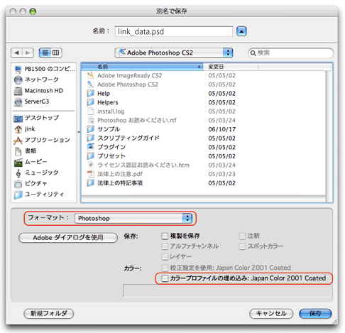 Illustrator CS2に貼り込む画像は、Photoshop PSD形式で保存します。ファイルメニューの[別名で保存]を選択します。[別名で保存]ウィンドウの[フォーマット]で「Photoshop PSD」を選択します。[プルーフ設定を使用]も[カラープロファイルの埋め込み]もチェックしません。